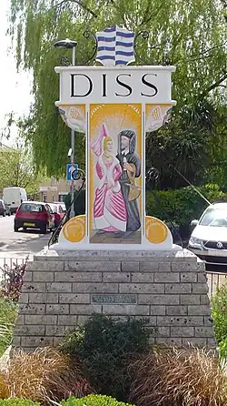 Diss is a market town, civil parish and electoral ward in South Norfolk, England; it is near to the boundary with Suffolk. It had a population of 7,572 in 2011.[1] It lies in the valley of the River Waveney, round a mere covering 6 acres (2.4 ha) and up to 18 feet (5.5 m) deep, although there is another 51 feet (16 m) of mud.[2]