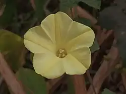 Twiners with deciduous, fulvous hairs. Leaf ovate, cordate, digitately five to seven lobes, 5 cm–12 cm × 4 cm–10 cm (2.0 in–4.7 in × 1.6 in–3.9 in); lobes dentate, ovate, acuminate. Cyme few-flowered; peduncle 3–5 cm (1.2–2.0 in), long Sepals ovate-lanceolate, obtuse and mucronate, to 2 cm (0.79 in) long. Corolla campanulate, yellow, glabrous, 3–5 cm (1.2–2.0 in) long Capsule globose, to 1 cm (0.39 in) across, yellow[3]