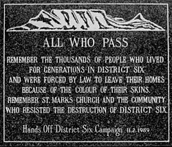 District Six (Afrikaans: Distrik Ses) is a residential neighborhood in Cape Town, South Africa, located next to the city's CBD. In 1959, people of color were banned from the area and most of them were resettled in Gugulethu. In the following years, District Six was then declared a whites-only area and most of the residents were resettled in the Cape Flats.[1] Over the course of a decade, over 60,000 of its inhabitants were forcibly removed and in 1970 the area was renamed Zonnebloem, a name that makes reference to an 18th-century colonial farm.[2][3][1] At the time of the proclamation, 56% of the district's property was White-owned, 29% Black-owned, 26% Coloured-owned and 18% Indian-owned.[4][5][1] The vision of a new white neighbourhood was not realised and the land has mostly remained barren and unoccupied.[1] The original area of District Six is now partly divided between the suburbs of Walmer Estate, Zonnebloem, and Lower Vrede, while the rest is generally undeveloped land.