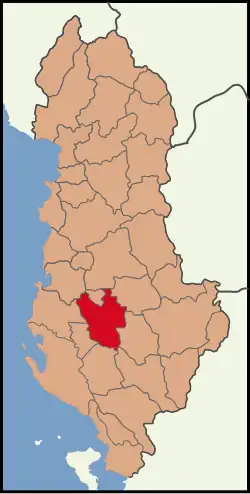 Berat District (Albanian: Rrethi i Beratit) was one of the 36 districts of Albania, which were dissolved in July 2000 and replaced by 12 counties. It had a population of 128,410 in 2001, and an area of 915 km2 (353 sq mi).[1] It is in the centre of the country, and its capital was the city of Berat. Another large population centre in this district was Ura Vajgurore. Its territory is now part of Berat County: the municipalities of Berat, Dimal, Poliçan (partly) and Kuçovë (partly).