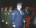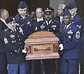 The photographs below show the DCARNG Honor Guardsmen and Airmen participating jointly in the funeral service of civil rights activist, Dorothy Height. The service was held on April 29, 2010, at the US National Cathedral building, Washington, DC. The eulogy was performed by former US President Barack Obama.[13] The Honor Guard composition depicts a 6-man pallbearer team.
