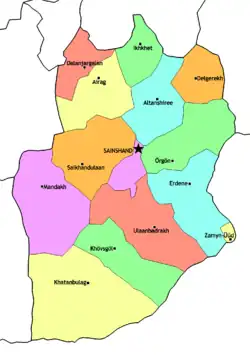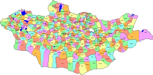 A district or sum (/sʊm/; Mongolian: сум ᠰᠤᠮᠤ) is a second-level administrative subdivision of Mongolia. The 21 provinces of Mongolia are divided into 330 sums.[1]