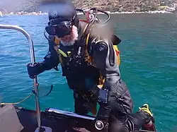 Divers may be picked up by a small tender or the dive boat may have a low enough freeboard for divers to climb over the side unaided, or with a bit of assistance from the crew. In this case it is usual to pass up heavy equipment such as weightbelts, and leave on the fins to help boost the diver out of the water. This is easiest with inflatable boats, particularly if provided with conveniently sited handles or ropes along the sides.[3] For higher freeboards and easier boarding, mechanical aids may be provided: