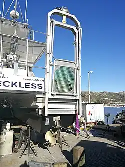 A diver lift is a platform which is lowered into the water on which the diver stands while being lifted up to deck level. The lift mechanism constrains sideways motions of the platform, and has sufficient hand-holds for the diver to stand securely during lifting. A lift may also be used to lower a diver into the water. In most cases the lift will be suitable for transporting a fully kitted diver in a standing position, but in special cases seating may be provided. It differs from a diving stage or basket, which is lowered to diving depth, as a lift generally can only be lowered deep enough to stand up after swimming over the platform, which for most divers will be between 1 and 1.5 metres (3.3 and 4.9 ft).[9] The lifting platform should have enough space to stand wearing fins, and there should be suitable handholds to allow the diver to be stable during lifting and lowering with a low risk of getting equipment or body parts in pinch points. The space allowed for walking between platform and boat should take into account the equipment likely to be carried by the diver, such as side mounted cylinders.