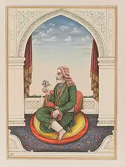 ![]() Diwan Sawan Mal seated holding a lotus. Watercolour by a Company artist, Punjab, c. 1865 | |