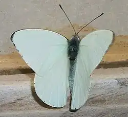 The wingspan is 40–48 mm for males and 40–52 mm for females.[3] The upperside of the wings of males is pure white with a narrow black forewing tip and small black dots on the hindwing margin.[1] The underside is whitish with two rows of black spots on the hindwings,[1] with the inner row sometimes absent or incomplete. The female has several colour forms,[1] but is usually pale yellowish white on the upper surface with heavier black markings than the male,[1] and has a dark spot on each forewing. There is a rare female form (luteola[3]) where the upperside is orange yellow[1] or deep apricot.[3] The underside of females is similar to the male but the rows of black dots are more pronounced and the base colour is pale to bright yellow. Another rare form (rubrobasalis) has orange suffusion at the base of the underside of the forewing[1] and a creamy-yellow upperside.[3] The dry-season form (alba[3]) has reduced black markings.[1] A distinguishing feature of D. pigea is that the hindwing costal has a yellow streak, unlike other Dixeia species.[3]