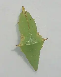 The pupae have an unusual shape, with a pointed 'nose' and a notable spike on each side of the body protruding from a broad, flattened area midway down the body. There is a smaller spike both to the fore and rear of each of these larger spikes, and a small spike on each side of the body just to the rear of the head. The larger spikes resemble to some extent the double, hooked thorns on the stems of the food plant, Capparis tomentosa (see image). The pupae may be pale green, dark green or brown in colour. The wing areas show whitish or yellowish with dark spots near to hatching and the body becomes greyish.