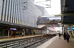 Dixi can be accessed from the west from Ratatie, which handles the arriving connections of the bus terminal[4] or from the railway platforms via a station bridge with a roof and glass walls connecting to the third floor. The station bridge and most of the railway platforms are actually located in the neighbouring district of Jokiniemi. However, the businesses on the station bridge are not counted as part of the Dixi shopping centre.[1][5][6] On the other end of the station bridge is also located the Väritehtaankatu 8 office and business building in Jokiniemi, which is not part of Dixi. This building hosts offices, a lunch restaurant and a gym.[7] The second phase of the building on Väritehtaankatu was completed in late 2021, consisting of an additional building with six floors and a total floor space of 4,000 m2 (43,000 sq ft).[8]