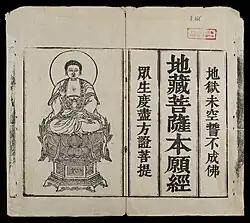 The Kṣitigarbha Bodhisattva Pūrvapraṇidhāna Sūtra was first translated from Sanskrit into Chinese between 695 and 700 CE, during the Tang dynasty, by the Tripiṭaka master Śikṣānanda,[5] a Buddhist monk from Khotan who also provided a new translation of the Avataṃsaka Sūtra and the Laṅkāvatāra Sūtra. However, some scholars have suspected that instead of being translated, this text may have originated in China, since no Sanskrit manuscripts of this text have been found. Part of the reason for suspicion is that the text advocates filial piety, which was stereotypically associated with Chinese culture. It stated that Kṣitigarbha practised filial piety as a mortal, which eventually led to making great vows to save all sentient beings. Since then, other scholars such as Gregory Schopen have pointed out that Indian Buddhism also had traditions of filial piety.[6] Currently there is no definitive evidence indicating either an Indian or Chinese origin for the text.