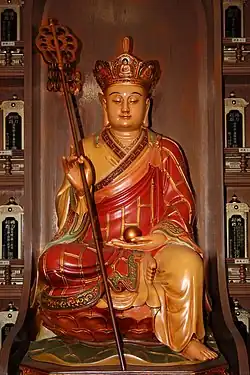 In some areas, the admixture of traditional religions has led to Kṣitigarbha being also regarded as a deity in Taoism and Chinese folk religion. Kṣitigarbha Temples (Chinese: 地藏庵; pinyin: Dìzàng'ān) are Taoist temples that usually enshrine Kṣitigarbha as the main deity, along with other gods typically related to the Chinese netherworld Diyu, such as Yanluo Wang and Heibai Wuchang. Believers usually visit these temples to pray for the blessings of the ancestors and the souls of the dead.[14] The 30th day of the seventh month of the Chinese calendar is celebrated as his birthday.[15]