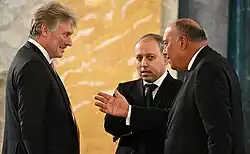 On 28 February 2022, in relation to the Russian invasion of Ukraine, the European Union blacklisted Peskov and had all his assets frozen.[72][73] The United States imposed similar sanctions on 3 March,[74] followed by Australia.[75] The United Kingdom imposed sanctions on 15 March.[76][77][78] The United States also sanctioned his wife, Tatiana Navka, and two of his children, Nikolay Peskov and Elizaveta Peskova.[79] Peskov was also sanctioned by the British government in 2023.[80]