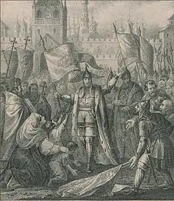 Dmitry Mikhaylovich Pozharsky (Russian: Дми́трий Миха́йлович Пожа́рский, IPA: [ˈdmʲitrʲɪj mʲɪˈxajləvʲɪtɕ pɐˈʐarskʲɪj]; 17 October 1577 – 30 April 1642) was a Russian prince known for his military leadership during the Polish–Russian War from 1611 to 1612. Pozharsky formed the Second Volunteer Army with Kuzma Minin in Nizhny Novgorod against the Polish–Lithuanian Commonwealth's occupation of Russia during the Time of Troubles, resulting in Polish withdrawal after Russian victory at the Battle of Moscow in 1612.[1] Pozharsky received the unprecedented title of Saviour of the Fatherland from Mikhail I of Russia, becoming a folk hero in Russian culture and honored in the Monument to Minin and Pozharsky in Moscow's Red Square.[2]