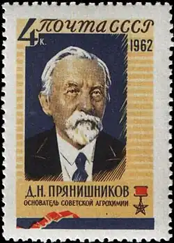 Dmitry Nikolayevich Pryanishnikov (Russian: Дми́трий Никола́евич Пря́нишников; 6 November 1865 — 30 April 1948[1]) was a Soviet and Russian agrochemist, biochemist and plant physiologist, founder of the Soviet scientific school in agronomic chemistry. Hero of Socialist Labour (1945).[2] Winner of Lenin Prize (1926), Stalin Prize (1941) and Timiryazev Prize (1945).[3]