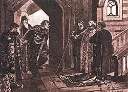 Dmitriy Yurievich Shemyaka (Russian: Дмитрий Юрьевич Шемяка) (died 1453) was the second son of Yury of Zvenigorod by Anastasia of Smolensk and grandson of Dmitri Donskoi. His hereditary patrimony was the rich northern town Galich-Mersky. When his uncle prince Vasily I of Moscow died in 1425, he and his 10-year-old nephew Vasily started fighting over the right to the throne, causing the Muscovite War of Succession (1425–1453). Intermittently, Shemyaka managed to be recognised twice as Prince of Moscow (1445, 1446–1447).