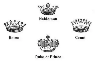 "Azure, a downward opened horse-shoe argent with a cross former of the same charged on the edge of its arch. Inside the horse-shoe an argent arrow whose downward point protrudes. Helmet with mantling azure, lined argent. Crowned. Crest: a vulture's wing with an argent arrow shot through."[1] There are four varieties of the coat of arms of which one is shown on RHS of top of the page.