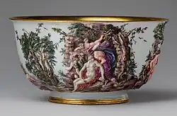 Ginori obtained wax models and casts from the heirs of major Florentine baroque sculptors Giovanni Battista Foggini and Massimiliano Soldani that were intended for casting in bronze,[10] and produced boldly-scaled porcelain figure groups “of a grandeur which makes the figures of most other C18 factories look petite and trifling,” John Fleming and Hugh Honour have observed.[11] Some statuettes of famous Roman sculptures were also produced. Over 150 sculptural pieces were produced.[1]