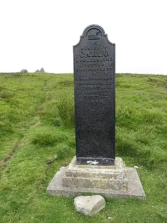 Carlo was a hunting dog, of the Red setter breed, owned by Henry Martyn Kennard (1833–1911). The Kennards, of Crumlin Hall, were local ironmasters and landowners, Henry Martyn's father Robert Kennard (1800–1870) having gained control of the Blaenavon Ironworks through his Blaenavon Coal and Iron Company in 1836.[2][a] At a shooting party held on the hill on the Glorious Twelfth in August 1864, Carlo was accidentally, and fatally, shot. Kennard had the dog buried at the site of the accident, and arranged for a memorial headstone to be cast at Blaenavon and erected over the dog's grave.[4]
