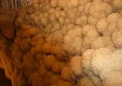 Dogtooth spar deposited on the walls of a part of the Caverns of Sonora near Sonora, Texas. The former water level can be seen in the upper left hand corner.