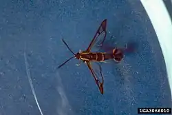 The average adult has a wing span of 18 to 22 millimeters. Both the fore and hind wings are mostly clear, and the thorax and the abdomen are navy blue or black with yellow markings. Female dogwood borers' fourth abdominal segment is entirely yellow, while the male's is black with a narrow yellow ring. In the Northeast, adult emergence begins in early June and continues into early September, peaking in mid July. The adults' emergence begins earlier further south.[2]
