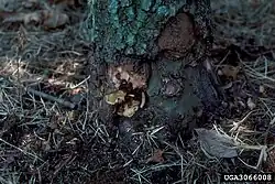 - Type III - This is the least frequent but most harmful of all the types of infestation. It usually occurs in the bark and in the main trunk of a tree. Feeding outside the burrknot is thought to be more harmful to the tree because healthy tissue is destroyed. These infestations have the potential to kill or girdle a tree but usually result in a slow decline and yield reduction for the tree.[2]