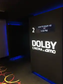 Dolby Cinema is a type of premium large format movie theater created by Dolby Laboratories that combines Dolby proprietary technologies such as Dolby Vision and Dolby Atmos, as well as other signature entrance and intrinsic design features. The technology competes with IMAX and other premium large formats such as Cinemark XD and Regal's RPX (Regal Premium Experience).[1][2][3]
