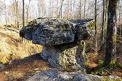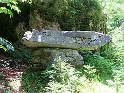 Dole consists of clusters of houses and various isolated farms along the road from Idrija to Medvedje Brdo. The landscape around the hamlet of Dolenje Dole has rolling terrain with tilled fields and small meadows, and the land around the hamlet of Gorenje Dole has sinkholes and an intermittent spring.[6] In the northern part of the village's territory, just west of the neighboring village of Ravne pri Žireh, there is a geological curiosity known as Tomaž's Table (Slovene: Tomaževa miza). It consists of a block of dolomitized limestone on which a slab of the same material was deposited; the slab is about 1 meter (3 ft 3 in) thick and is estimated to weigh 30 metric tons (33 short tons).[7] A similar formation, known as the Little Stone Table (Slovene: Mala kamnita miza), is located about 670 meters (2,200 ft) to the southeast.