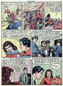 After refusing to pay Falco any more blackmail money, Martha was kidnapped by Falco and rescued by the "doll man". Finding that through intense concentration Dane could affect his height, he decided to begin to fight crime as the Doll Man, often assisted by Martha (who also became his scientific research assistant).[4]