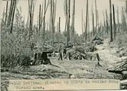 In 1938 Civilian Conservation Corps workers living at Camp Growden were tasked with fire hazard mitigation and other cleanup work in the surrounding Dollar Mountain Burn. Major focuses were snag patch cleaning to remove standing dead trees and fire line construction in preparation for controlled burns in service of fire management. Much of the timber cut was put through the small saw mill at Camp Growden and turned into low cost lumber.[13]