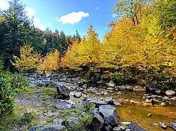 Spruce-edged sphagnum bogs are found in the upper sections of Red Creek and its tributaries, often in association with thickets of speckled alder. There are similar areas throughout the High Alleghenies, most famously the Cranberry Glades. The largest one at Dolly Sods is about a mile long and half a mile wide. The thick carpet of sphagnum moss and the polytrichum moss hummocks also sustain cotton grass, round leaf sundew and the lichen known as reindeer moss. In addition to the spruce, the bog margins are frequented by ferns, sedges and the occasional balsam fir. The three-toothed cinquefoil (Sibbaldiopsis tridentata) is often abundant and orchids—for example the pink lady's slipper—are sometimes seen.[17]