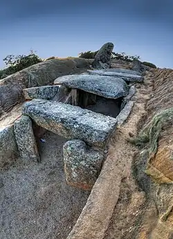 The megalithic complex has been reused in various historical periods, as it was used as a dwelling in Roman and Medieval times, something that irreversibly affected the burials and grave goods that were originally deposited inside. In the same way, its stone structure has suffered various attacks, such as serving as a quarry and being dynamited at the end of the 19th century, an event that José Ramón Mélida collects in his Monumental Catalog and from which marks such as holes for drill holes or breaking wedges are left in various slabs on the site.[11] Fortunately, its robustness and the fact that these events only affected some parts of the structure, have allowed its imposing original appearance to be imagined even today.