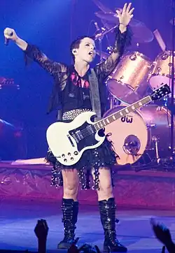 She has been recognised as a style icon, sporting a pixie cut or buzzed hair in the 1990s, and performing barefoot, saying "it just feels comfortable and honest to pull your toes along the ground".[8][63][64] Billboard's William Goodman described O'Riordan performing "Barefoot and strutting onstage, an Irish warrior poet with a bleached blonde pixie cut, gold chain necklace, singing without a flinch, as if it were ordained".[5] The New York Times mentioned that O'Riordan was responsible for a large portion of Dr. Martens boots sales in the 1990s.[62]