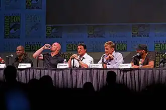 In 2010, Lundgren made a guest star appearance on the TV series Chuck in the fourth-season premiere episode, "Chuck Versus the Anniversary", as Russian spy Marco, with references to Rocky IV's Ivan Drago.[114] He then played a drug-addled assassin in the ensemble action film The Expendables, in a cast which includes popular action stars such as Stallone, Jason Statham, Jet Li, and Randy Couture as a group of elite mercenaries, tasked with a mission to overthrow a Latin American dictator. It was described by Lundgren as "an old-school, kick-ass action movie where people are fighting with knives and shooting at each other."[115] The film received mixed reviews from critics but was very successful commercially, opening at number one at the box office in the United States, the United Kingdom[116] China[117] and India.[118]