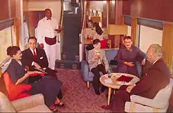 "Pleasure Dome" short dome cars built by Pullman-Standard in 1950 for the Atchison, Topeka & Santa Fe for its Super Chief train.[6] The six cars had both lounge and dining facilities, including the unique "Turquoise Room", a small dining area identified by the turquoise Native American medallion displayed on one of the room's walls.[7][8]