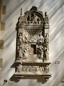 Domenico Gagini was the first sculptor of this family to achieve international fame. Born at Bissone, in the Ticino (now part of Switzerland) he studied in Florence under Brunelleschi.[3] Returning to Genoa in 1447 he worked on the sculpture of the dome of the church of S. Giovanni Battista. In 1457 he was recorded as working in Naples for Alfonso of Aragon. In 1463 he arrived in Palermo, Sicily where he, and later his family including Giovanni Gagini and Antonello, influenced the decorative architecture of the island, in works of both decorative and figure sculpture.