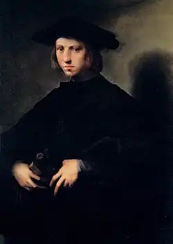 Similarly to the conditions of Puligo's Madonna and Child Paintings, there are very few documented portrait paintings by Puligo, two of which are mentioned by Vasari. The only signed and dated portraiture work attributed to him Puligo is the Portrait of a Young Man Writing.[4][6] The premise of this attribution rests upon its comparable stylistic qualities with other works by Puligo during the early 1520s, as only Puligo's first name, Domenico, is specified in a 1523 letter addressed to the artist by the sitter.[6] This portrait has been said to have been influenced by Raphael's portrait of Tommaso Inghirami.[4] The two portrait paintings that Vasari mentions are of Barbara Fiorentina and Pietro Carnesecchi.[6][8] The latter is regarded by Vasari to be the most beautiful of his portraits[8] and is now in the Uffizi Gallery.[3]