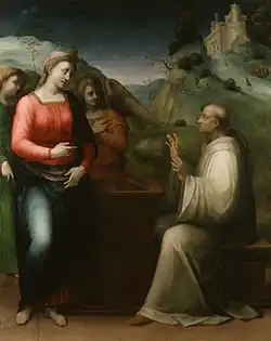 Puligo's Vision is widely regarded as the piece that epitomizes his most classical phase and was praised by Vasari to be the finest of his works.[6] Puligo based this piece on Perugino's painting on the same subject.[6] Despite the difference in the settings of the two painting, it is apparent that the way in which Puligo has arranged the poses of the figures completely duplicates those within Perugino's piece.[6] There are only four figures in the scene, all of whom appear to have inactive stances, amplifying the overall quietude present within the composition.[6] The gestural and visual exchange taking place between the Virgin and St. Bernard occupying each side of the piece, allows the painting to be evenly weighted.[6]