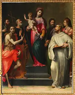 This composition was commissioned about a year, in 1525, after the presumed completion of Vision, as an altarpiece for the Cestello Chapel at Santa Maria Maddalena de' Pazzi in Florence, now known as the da Romena Chapel.[6] In the painting, a Madonna holds the Infant Christ surrounded by six saints: John and Baptist, Paul, Peter, Matthew, Bernard and Catherine of Alexandria. This piece is similar to Vision in terms of size as well as the fact that the figures within are also depicted in full-length. It is said that, in creating this piece, Puligo was influenced by Sarto's Madonna of the Harpies, as well as Fra Bartolomeo's Sacre Conversazioni.[6]