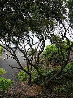 Mastwood (Calophyllum inophyllum) is a widespread timber tree native to tropical Asia. It is notable for its ability to grow to massive sizes in sandy or rocky beaches of island and coastal habitats, as well as its habit of sending out arching large trunks over the water where its seeds are dispersed via the currents.[49][50] Due to these characters, mastwood are of particular importance to traditional shipbuilding of the larger Austronesian outrigger ships and were carried with them as they migrated to Oceania and Madagascar.[50]