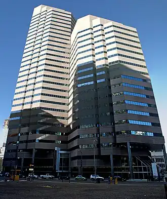 Dominion Towers is an office complex in Denver, Colorado. It consists of two adjoining towers, and was built in 1982. The taller one, Dominion Towers South, is 384 feet (117 m) tall and has 28 floors. The buildings have pink granite facades and blue-tinted windows.
