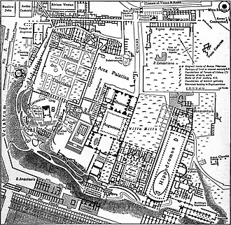 The name Domus Tiberiana first appears in the Histories of Tacitus in connection with the assassination of Galba in 69 AD.[12] However, earlier references to the houses of Caligula, Claudius and Nero on the Palatine by authors like Suetonius and Plutarch accord with the location of the Domus Tiberiana, making it likely these were one and the same house.[13] Anthony Barrett suggested that the name "may have been coined to define the original structure, to draw a distinction with the later period when the general term palatium became associated specifically with the huge palace complex built over the area by Domitian."[14]