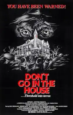 Don't Go in the House[i] is a 1980 American slasher film written and directed by Joseph Ellison, written by Ellen Hammill and Joe Masefield, and starring Dan Grimaldi. Its plot follows a disturbed man who, after suffering an abusive childhood in which his mother punished him with burning, becomes a pyromaniac and serial killer who kidnaps and burns alive any women who resemble her.