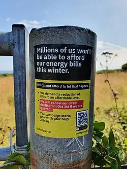 Don't Pay UK was a grassroots direct action campaign in the United Kingdom that urge collective non-payment of energy bills.[1][2] They planned to begin non-payment on 1 October 2022, when regulator Ofgem's price cap was set to rise, if one million individuals had signed up. On this date, 200,000 individuals had pledged non-payment, and Prime Minister Liz Truss had set a lower price cap than projected, so the strike did not go ahead. On 1 December 2022, the group encouraged non-payment to begin.