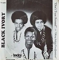 Black Ivory's debut single, "Don't Turn Around", was released in April 1971 and serves as the title track of their debut album. The song entered the Billboard Soul singles chart in November 1971, reaching its peak at No. 38 in January 1972.[2] The single, along with the B-side, "I Keep Asking You Questions", written by Black Ivory and Adams, was recorded at Sigma Sound Studio in Philadelphia, Pennsylvania.