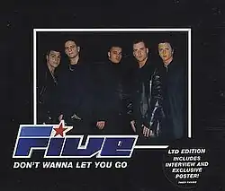 "Don't Wanna Let You Go" is a song by British boy band Five. Written by producers Richard Stannard and Julian Gallagher with band members Abs Breen, and Jason "J" Brown, and Sean Conlon, the song was released on 14 February 2000 as the fourth single from Five's second studio album, Invincible (1999).