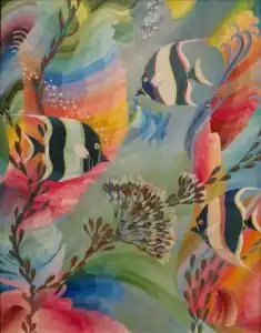 Blanding's paintings often portray undersea views, flowers and branches. Underwater Scene, from c. 1927–30, demonstrates his use of sharp outlines and lack of shading. His ink drawings are a powerful part of his many literary publications.[30] From 1938 to 1942, Don Blanding designed Hawaiian themed tableware for Vernon Kilns, near Los Angeles, California. The patterns he designed are Aquarium, Coral Reef, Delight, Ecstasy, Glamour, Hawaii, Hawaiian Flowers, Hilo, Honolulu, and Lei Lani.[31][32]