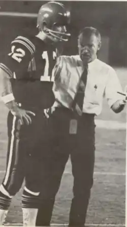 Coryell interviewed for Wisconsin's vacant head coach after the 1969 season, but ultimately stayed in San Diego for another three seasons.[57][10] With future NFL MVP Brian Sipe the quarterback the Aztecs went 9–2 in 1970,[58] winning their first nine games before losing to Long Beach State, who shared the PCAA title with them.[27] The loss broke a 31-game unbeaten streak and ended a 55–1–1 run that had begun in 1965.[59] The 1971 season was Coryell's worst with San Diego State, as they finished with a 6–5 record; it was the only time one of his Aztec teams lost more than two games in a season.[27] Coryell was hampered by a new rule imposed by the university's Student Council removing preregistration privileges from athletes, meaning that they could not be sure of being on the courses they desired. This made recruitment much harder for Coryell, who needed to replace half his team every season due to his reliance on bringing in juniors with only two years of eligibility. He later said, "I couldn't tolerate having my future riding on the whims of others. That's when I started seriously thinking of finding a new job."[60] After interviewing for a vacancy with the Denver Broncos but failing to win the job, Coryell stayed for one further year in San Diego.[61] The Aztecs rebounded to finish 10–1, winning the PCAA with a 4–0 conference record.[27]