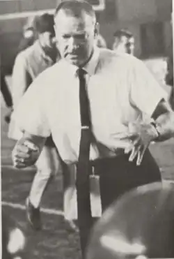 Coryell was named the Aztecs' new head coach on January 11, 1961, and predicted that San Diego State would be a leading small college by 1963.[28][29] He installed the I formation,[30] and instituted a policy of recruiting juniors who had played for two years at junior colleges in Southern California, reasoning that this policy allowed the Aztecs to study their recruits and be sure of their abilities before signing them, avoiding wasting any of their limited budget on sub-standard players.[31][29] Among his first crop of junior recruits was future Hall of Fame head coach Joe Gibbs.[32][33] The Aztecs improved rapidly under Coryell, as he led the team to a 7–2–1 record in his first season.[27] They followed with their first CCAA title for a decade, going 8–2 overall and 6–0 in their division.[27] The decisive game came against Fresno State, who had won the CCAA the previous four consecutive seasons. Before a capacity crowd of 13,000, the Aztecs ended an eight-game losing streak to their rivals, winning 29–25. Coryell was carried from the field by his players at the end of the game. At this point, his offense was based primarily around the run; in the game against Fresno State, the Aztecs gained only 9 yards passing against 269 rushing.[34] Coryell's success led to speculation that he might take a role with the San Diego Chargers or a larger college, but he affirmed his intention to stay with the Aztecs.[35] San Diego State went 7–2 in 1963, earning a share of the CCAA title. They scored at least 30 points in each of their first seven games.[27]