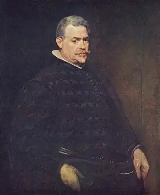 This work is widely attributed to Diego Velázquez and has been dated to 1632 or 1633.[1] The portrait is referenced in 1685 among the assets of Cesare Ignazio of Modena as "ritratto di Monsu Velasco [...] quale figura que ha le mani solo abbozzate" or "portrait of Signor Velasco ... hands but roughly sketched".[2] Sold as the work of Rubens in 1746 to Augustus III of Poland, it passed from his collection into the Gemäldegalerie Alte Meister in Dresden, where for some time it was considered the work of Titian.[3][4]