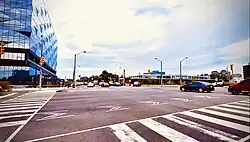 ![]() Intersection of Don Mills Road and Eglinton Avenue, looking north toward Wynford Drive. | |||||||