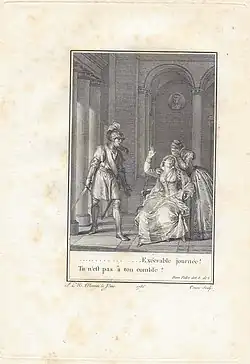 The Comédie-Française declined to put on the play, and it was not taken up by any other theatre. This rejection was not particularly to do with the play's critical attitude towards the Church, but more to do with the unsatisfactory and inconsistent characterisation.[2] When the play was published, Voltaire added a dedicatory letter to d'Alembert and a historical and critical discourse about the tragedy, as well as four short texts: Éloge historique de la raison, De L'encyclopédie, Dialoque de Pégase et du vieillard and La Tactique.
